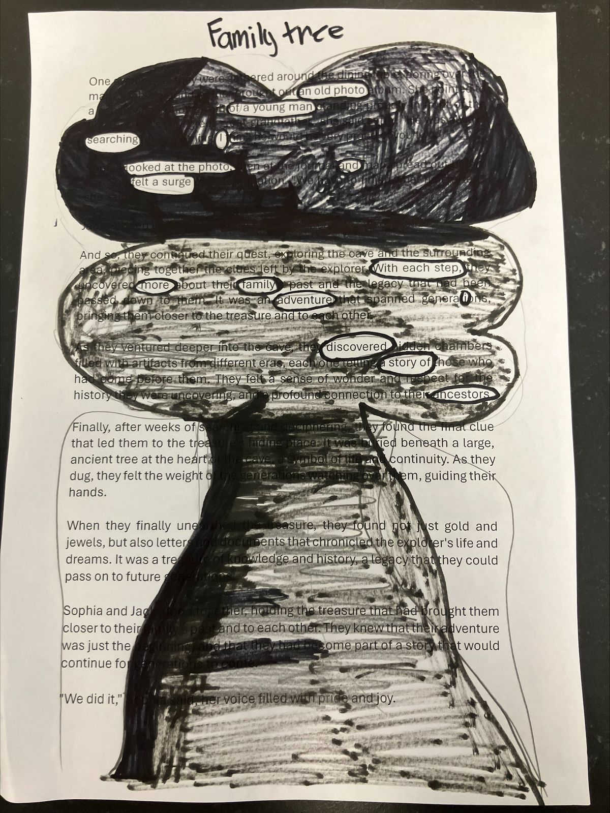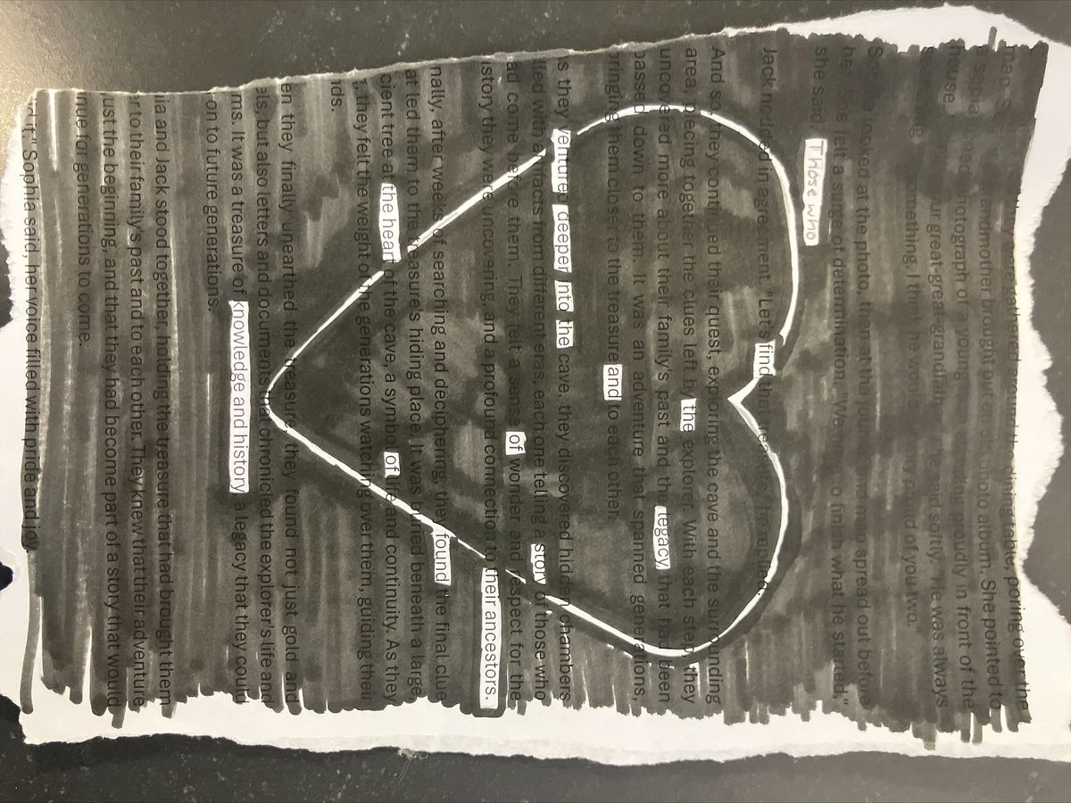 After engaging in many different activities, over several visits, students will be working towards writing memoirs based on the stories and experiences shared by the participants in their English classes. To begin this process, students have been focusing on creative writing as well as interviewing and discussion skills. In one creative and hands-on lesson, students learned about black-out poetry, and put some of their creative talents to good use.